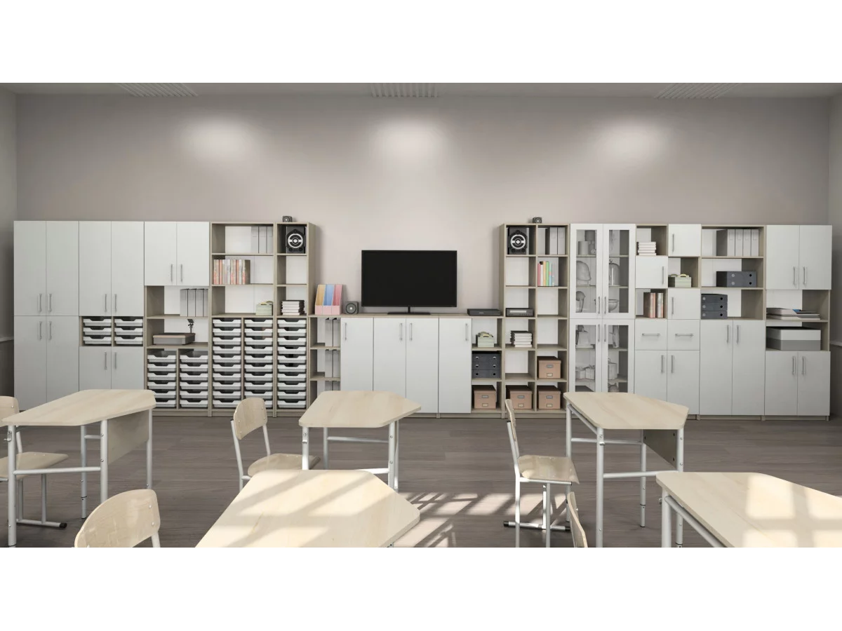 Biroul profesorului — practic și minimalist, echipat cu sertare pentru depozitare, ceea ce permite organizarea eficientă a spațiului de lucru al profesorului și concentrare pe desfășurarea lecțiilor.