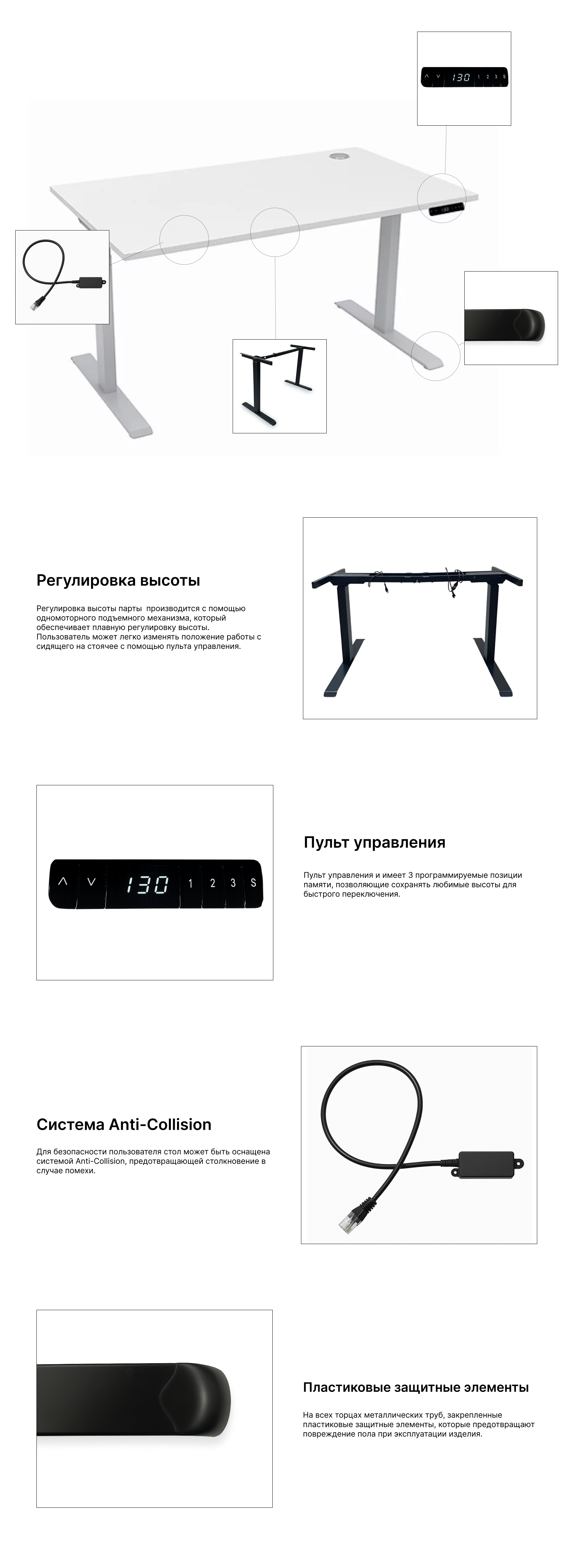- Для безопасности пользователя стол может быть оснащен системой Anti-Collision, предотвращающей столкновение в случае помехи.