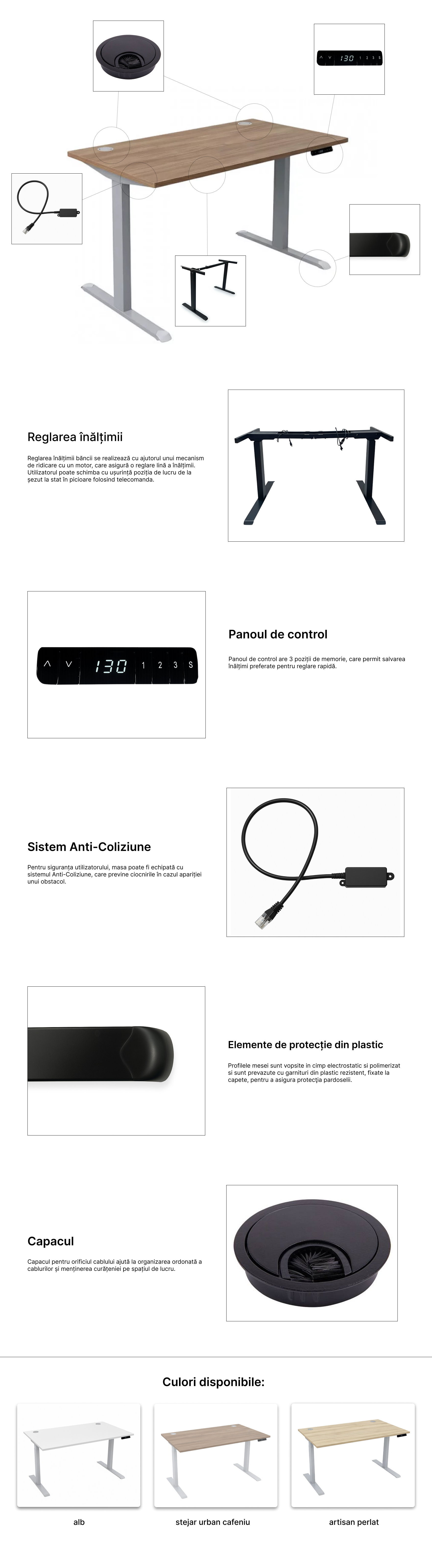 - Construcția cadrului conține coloane, permițând ridicarea și coborârea uniformă a blatului într-un interval larg de înălțime – de la 718 mm la 1178 mm.