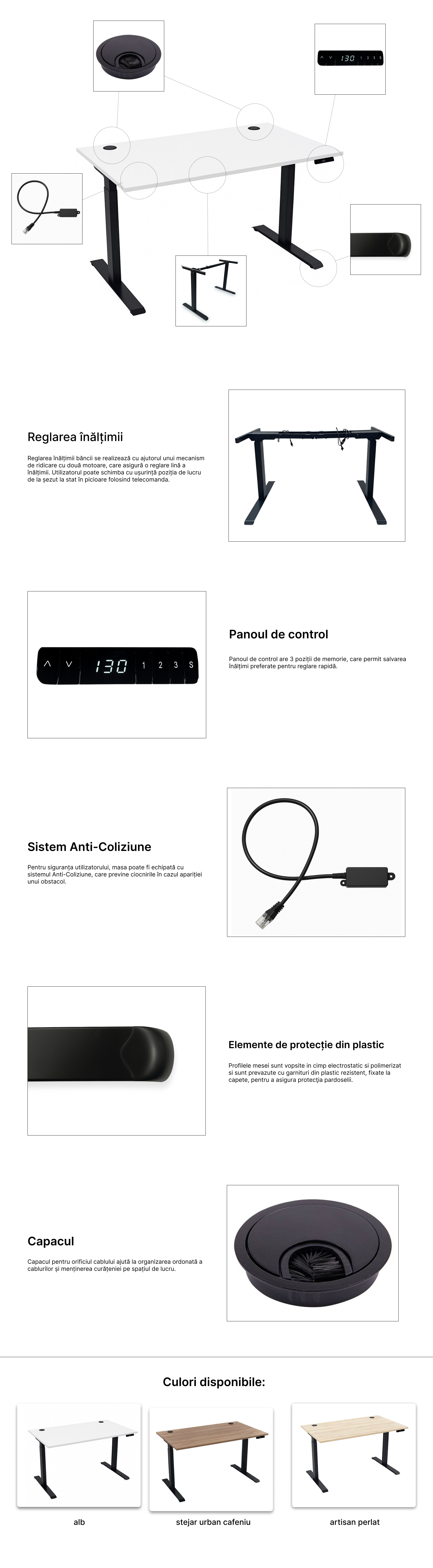 - Pentru siguranța utilizatorului, birou poate fi echipată cu un sistem Anti-Collision, care previne ciocnirea în cazul unui obstacol.