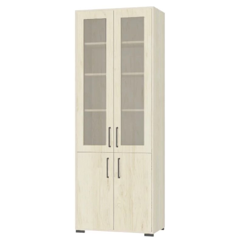 - Dulapul contine 4 rafturi vizibile cu usi de sticla in rama în partea de sus, și două uși din PAL cu rafturi închise în partea de jos.