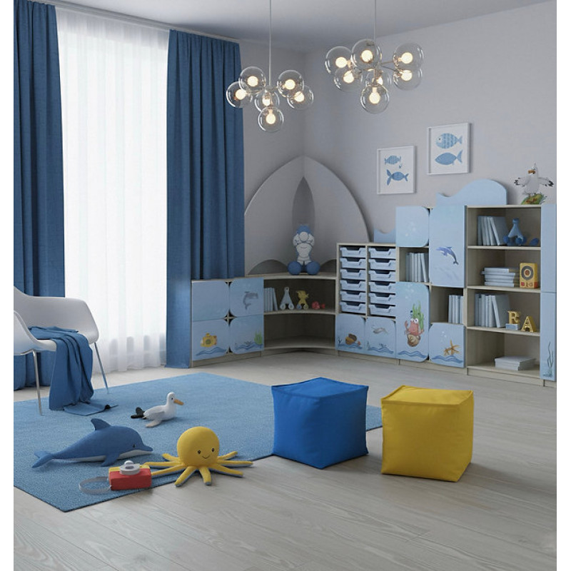 - Fațadele dulapului sunt profilate, cu o adâncitură specială pentru deschidere și decorate cu imprimare foto rezistentă la apă, cu imagini pe teme marine.