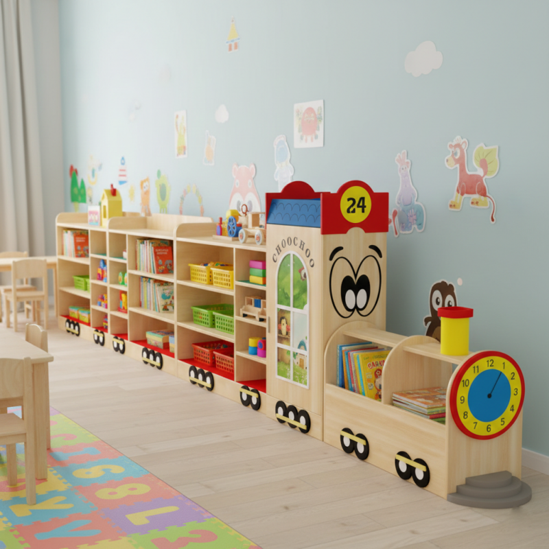 - Etajera este proiectat sub forma unui tren și constă din mai multe secțiuni cu rafturi deschise.