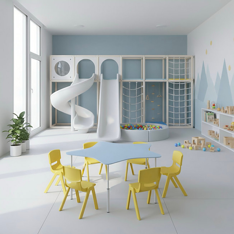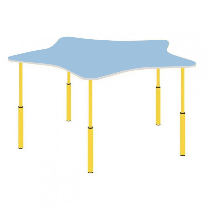 - Blatul mesei este realizat in forma de stea din PAL laminat colorat de 16 mm grosime, cu cant din ABS de 1,00 mm
