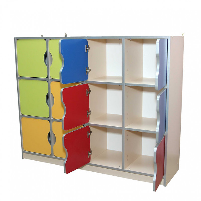 - Dulapul contine 12 rafturi cu usi colorate, cu colturi rotunjite si sunt prevazute cu un loc special pentru deschidere.