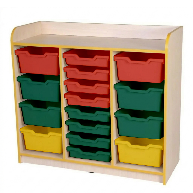 - Dulapul include 14 cutii de depozitare din plastic in culori galben, rosu si verde, cu dimensiuni diferite si o polita deasupra dulapului.