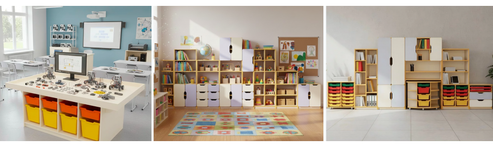 La alegerea unui dulap sau set de mobila este nevoie de tinut cont de urmatoarele necesitati: sa se tina cont de necesitatile de depozitare, sa fie fiabil, si sa ne incadram in spatiul clasei.