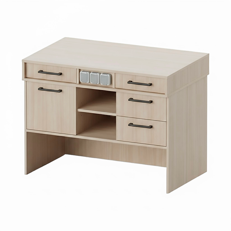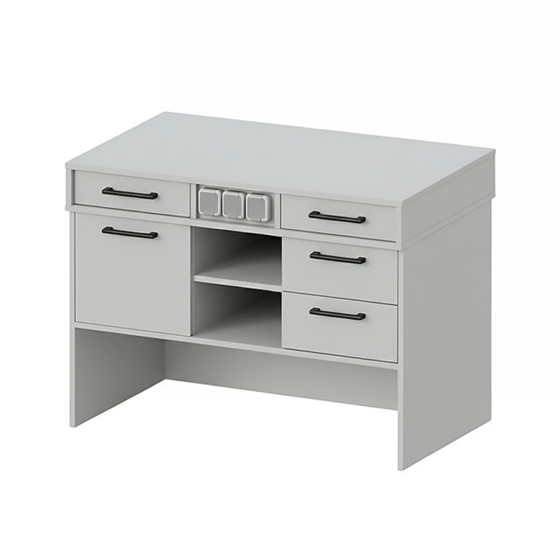 - Corpul lateral este format din trei compartimente: în partea stângă se află două sertare pe ghidaje cu bile, în centru — un raft deschis, iar în partea dreaptă — un compartiment cu raft, închis cu ușă.