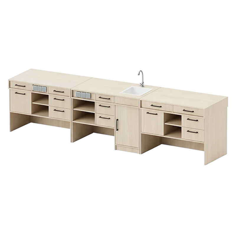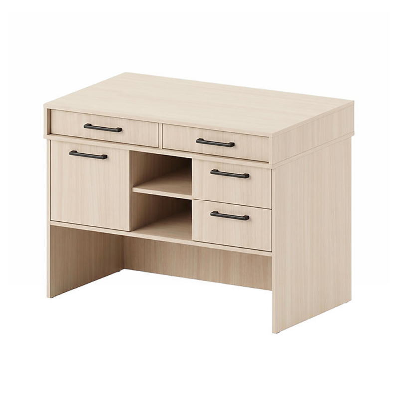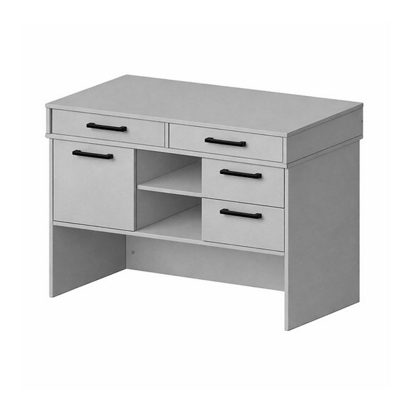 - Corpul lateral este format din trei compartimente: în partea stângă se află două sertare pe ghidaje cu bile, în centru — un raft deschis, iar în partea dreaptă — un compartiment cu raft, închis cu ușă.